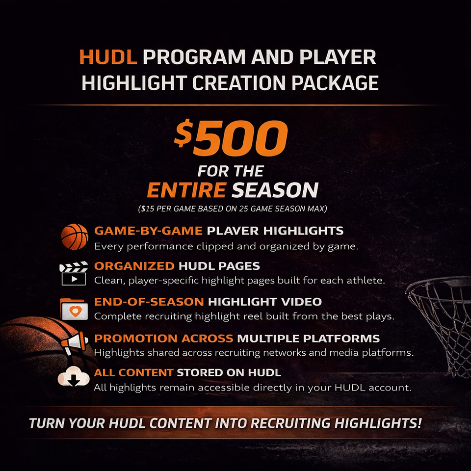 This package is designed for high school and AAU basketball programs that want their HUDL film transformed into professional highlight content for both the team and individual players.
